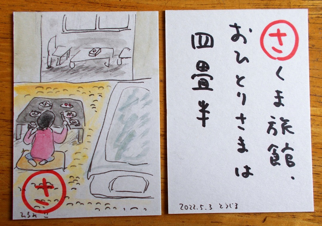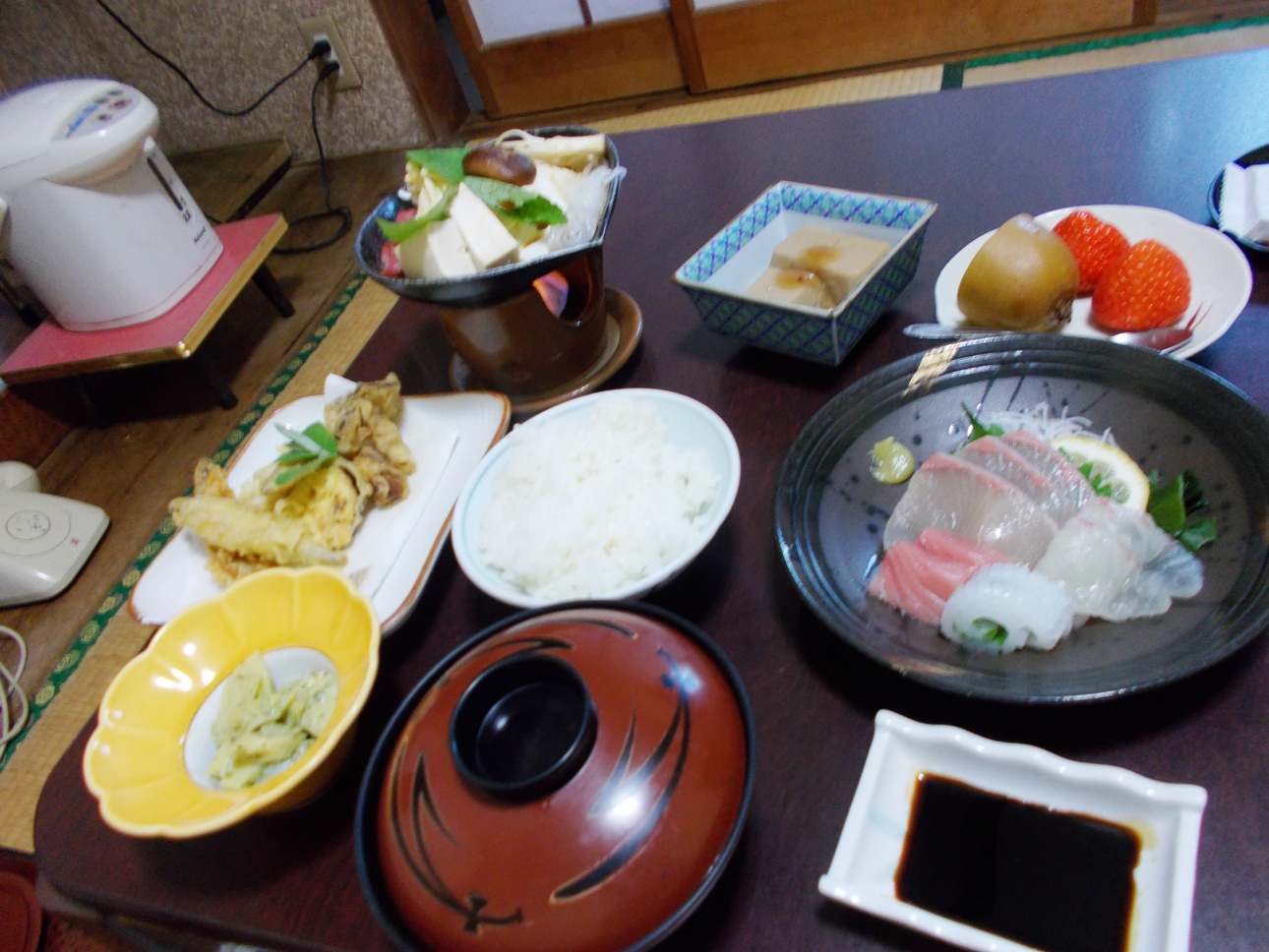 夕ごはんはその狭い4畳半に、お膳に乗ってやって来た。ご飯、あさり汁、タケノコ青菜和え。刺身(イカ・マグロ、ハマチ、鯛かスズキ+大根・ワカメのツマ)、天ぷら(ワカサギ、ナス、シイタケ+謎の山菜)、鍋(すき焼き)、ごま豆腐、デザート(イチゴ・キウイ)。1人用の小さな机にごちそうを並べ、お殿様になった気分だ。全部とってもおいしかった。