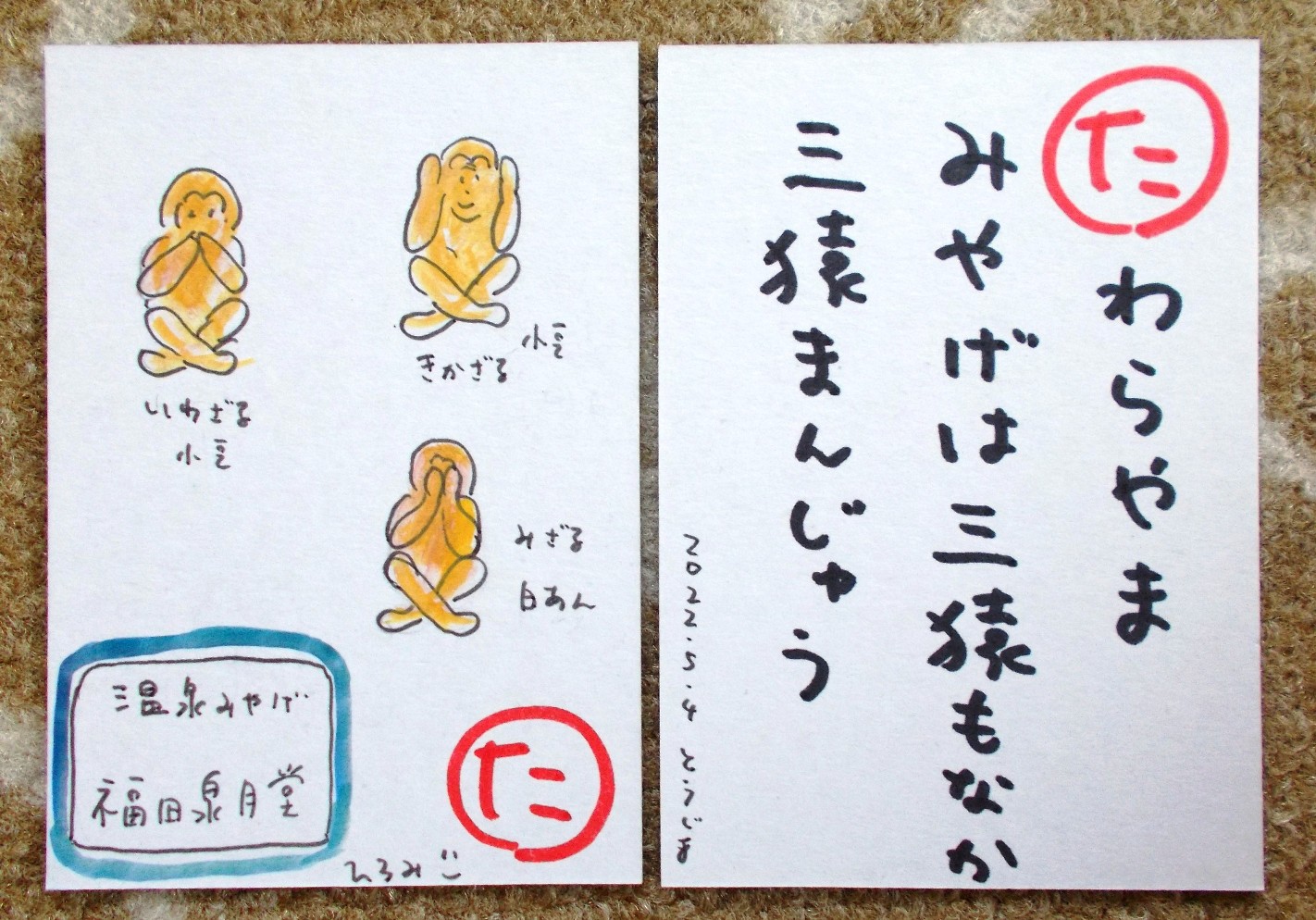 宿を出たすぐのところに「三猿まんじゅう」を売ってるお土産屋さんがあり、入ってみた。見てると「今焼けたばかり」と、猿まんじゅう1個、食べさせてくれた。アツアツで、おいしい。これが1個40円。